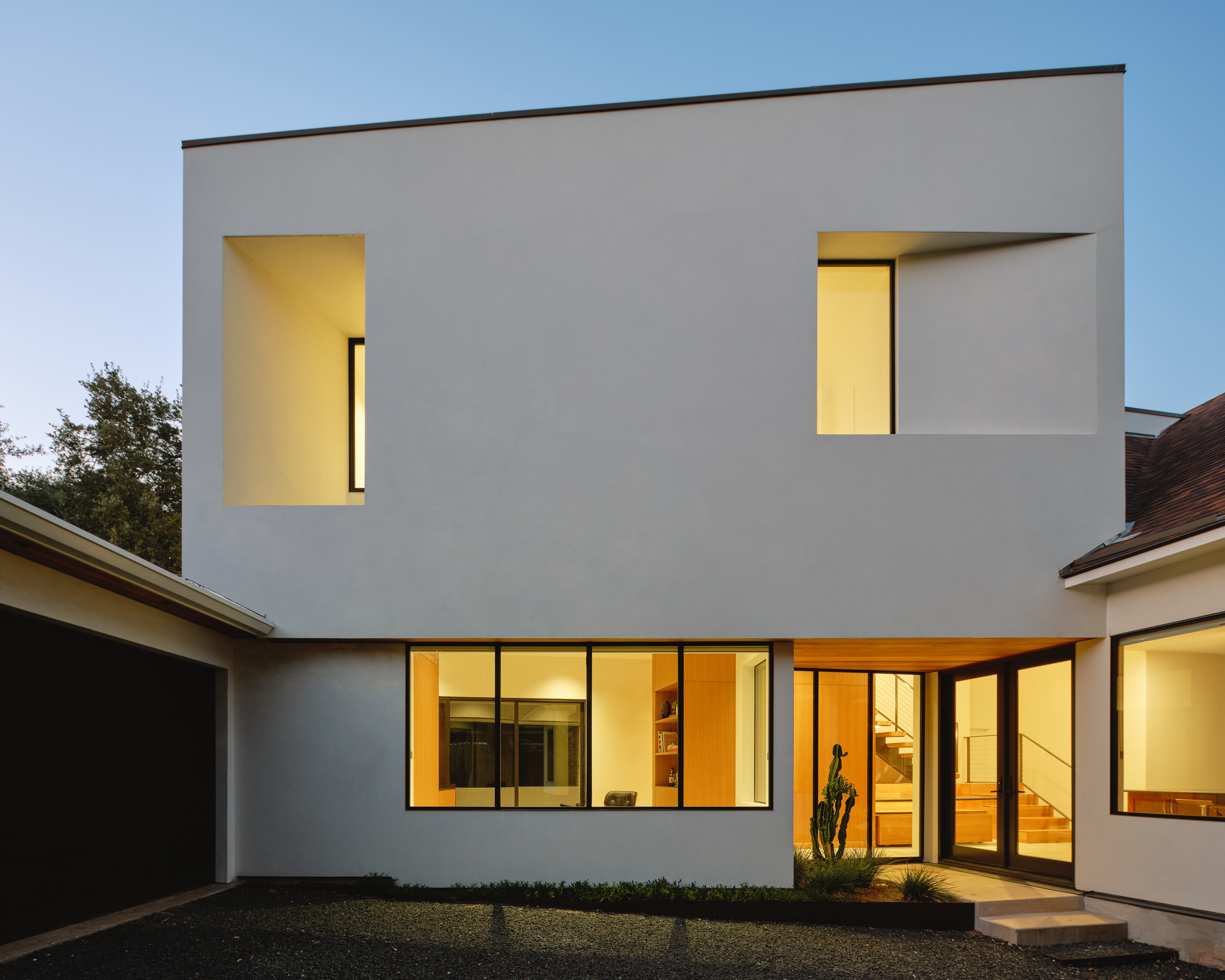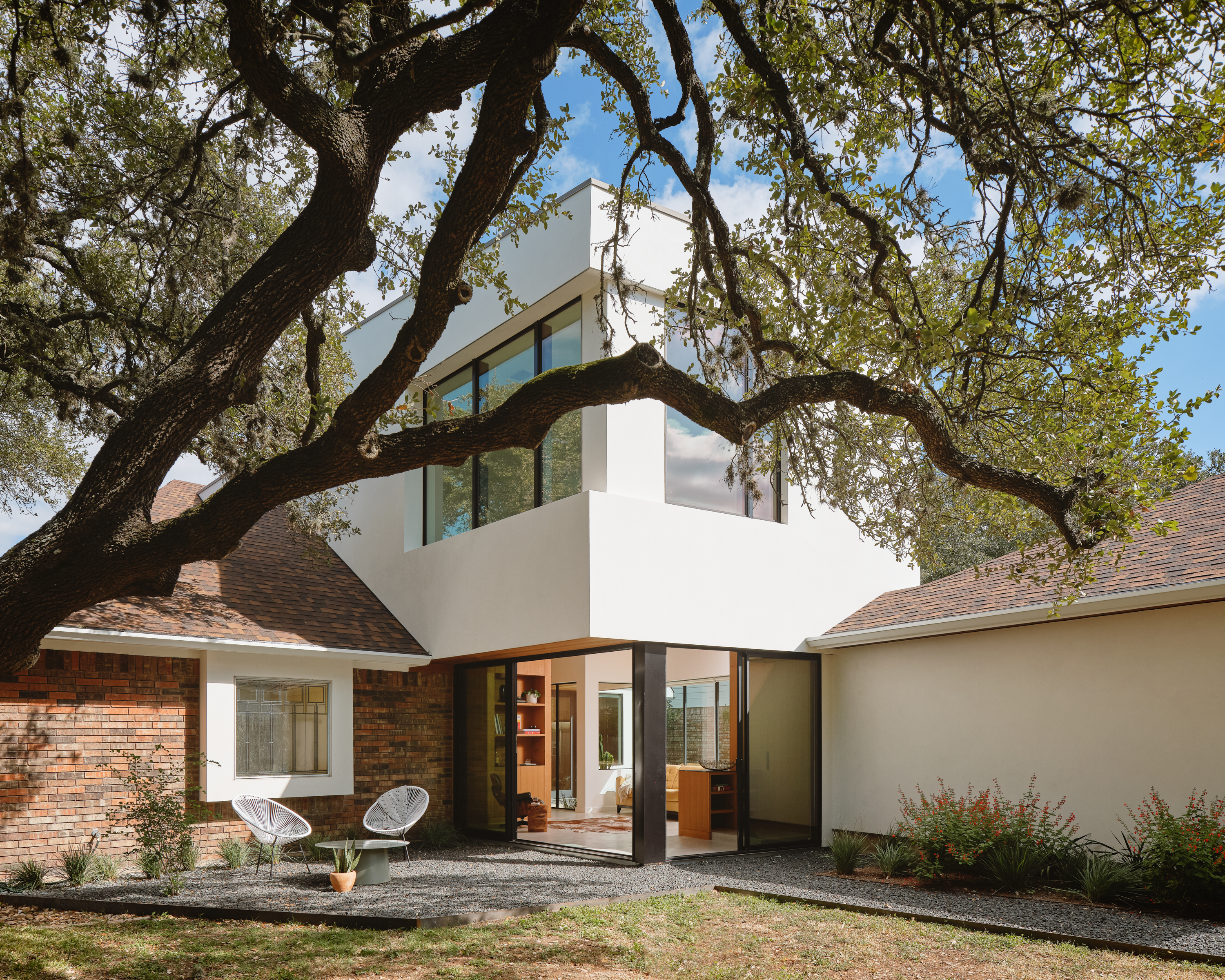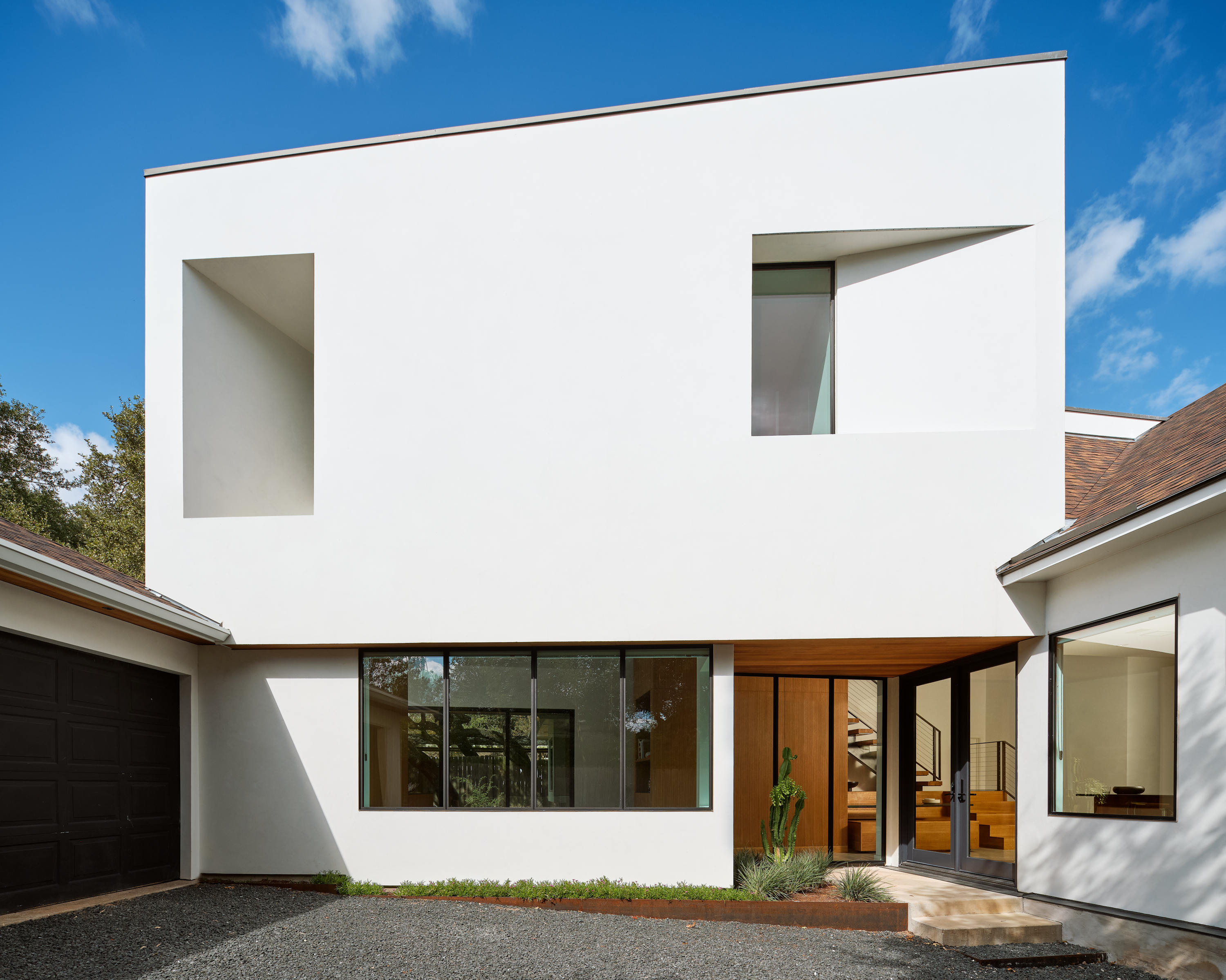 A language of distinct volumes organizes the design at both the site and functional scale. On the exterior, the new addition is a white, stucco-clad, two-story volume that is mostly hidden from the street to introduce a modern aesthetic while staying within the homeowner’s association’s guidelines.