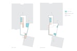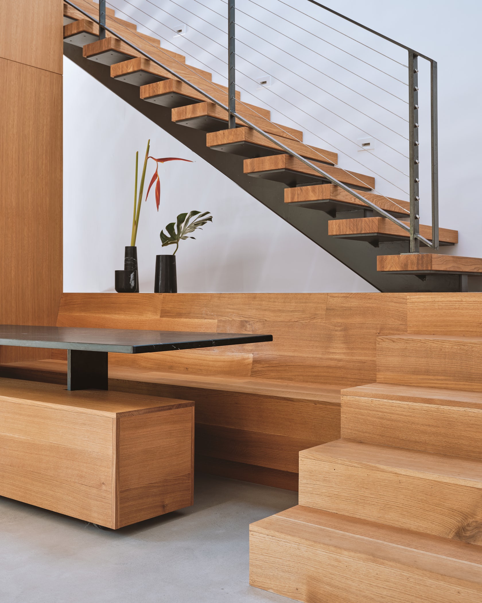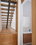 Meanwhile, on the interior, a millwork wall completes the garage volume and the wood clad powder room works with the built in dining bench and stair landing to create another pair of intersecting volumes.