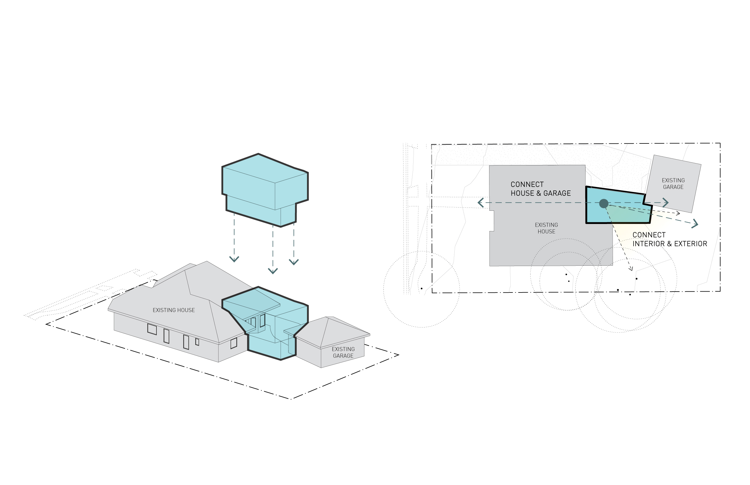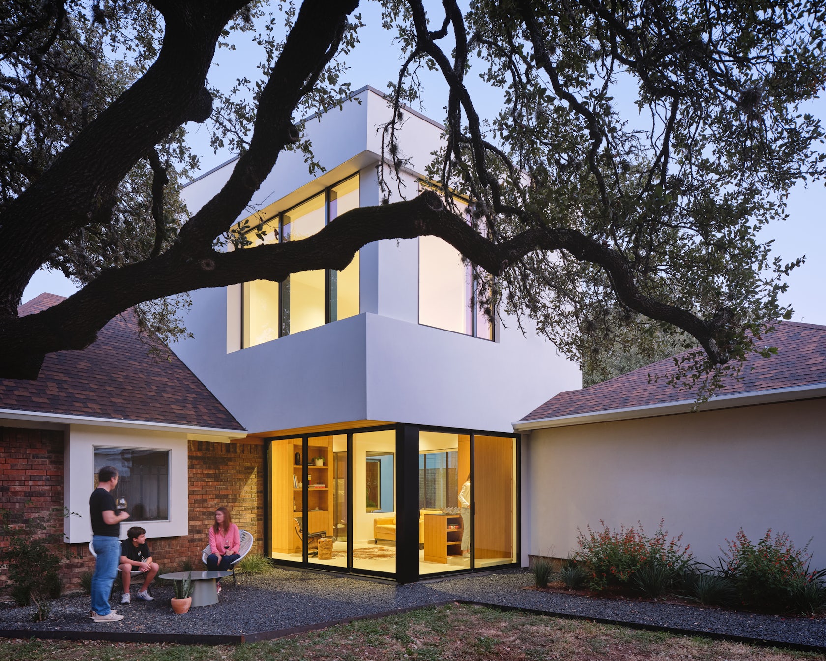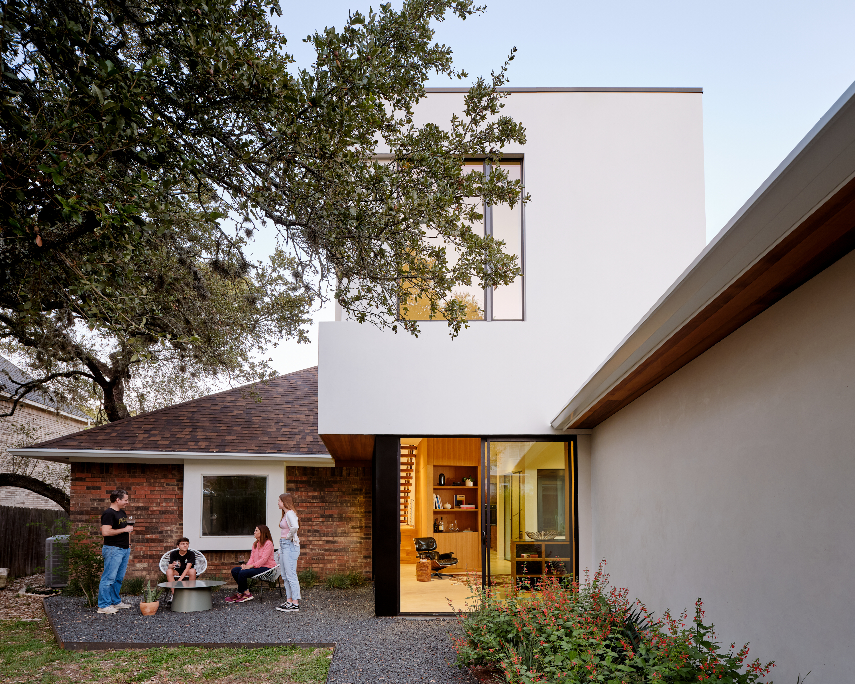 The articulated volumetric addition also increases the usability of the backyard by providing separation from the driveway and an indoor-outdoor connection to the new living space.
