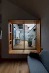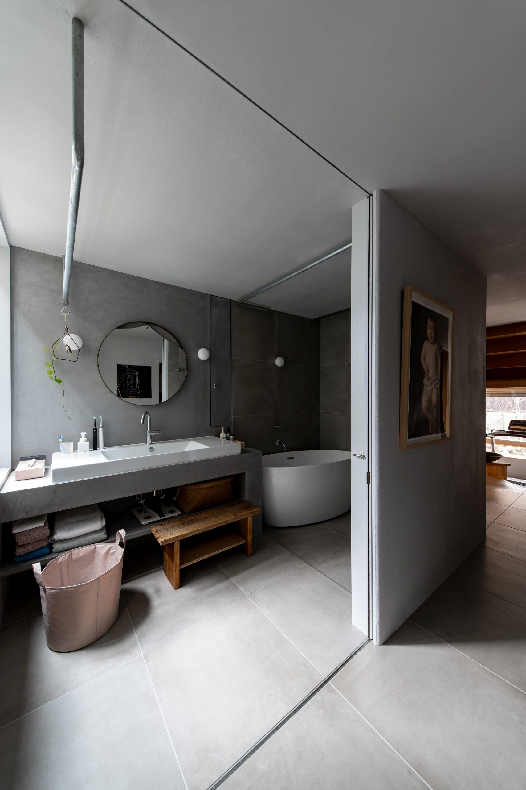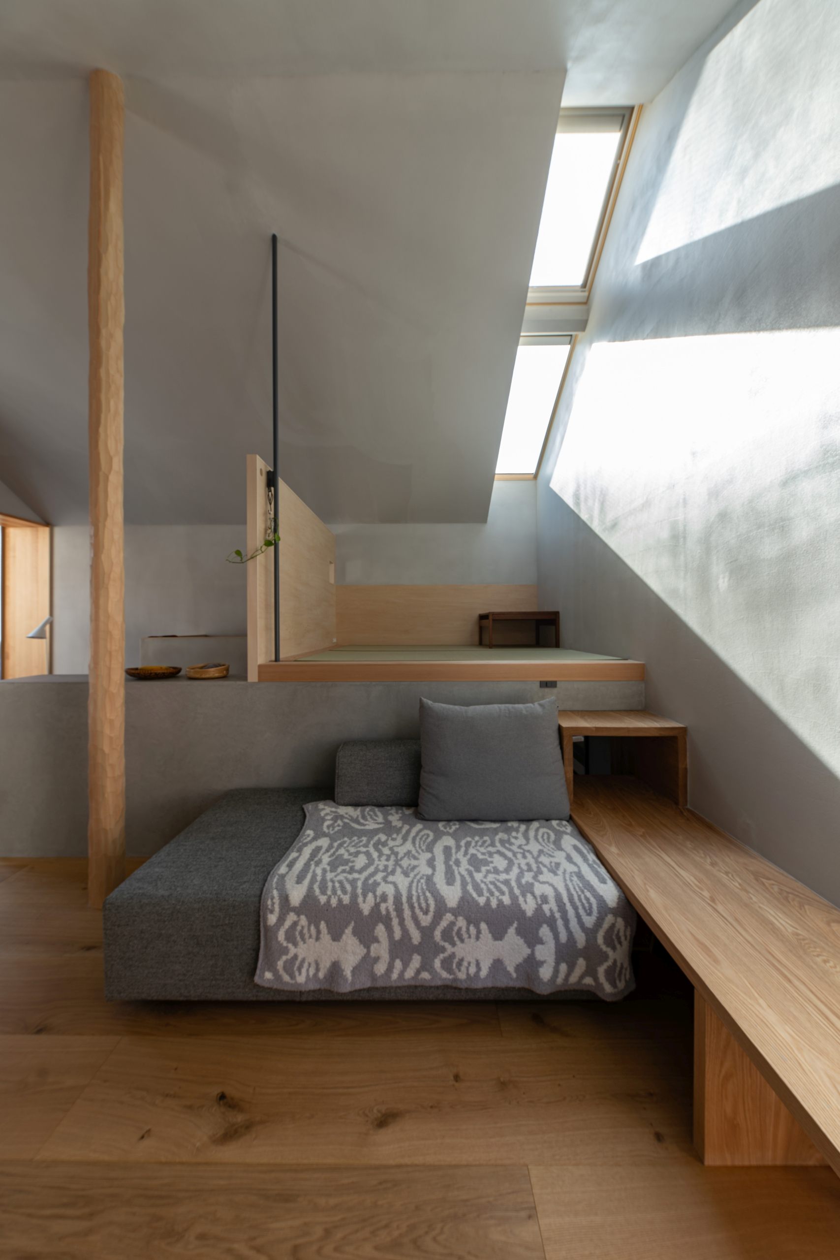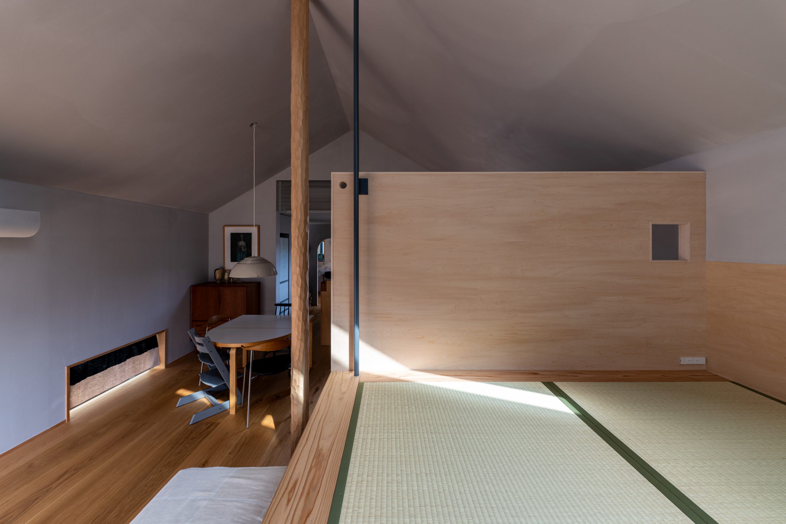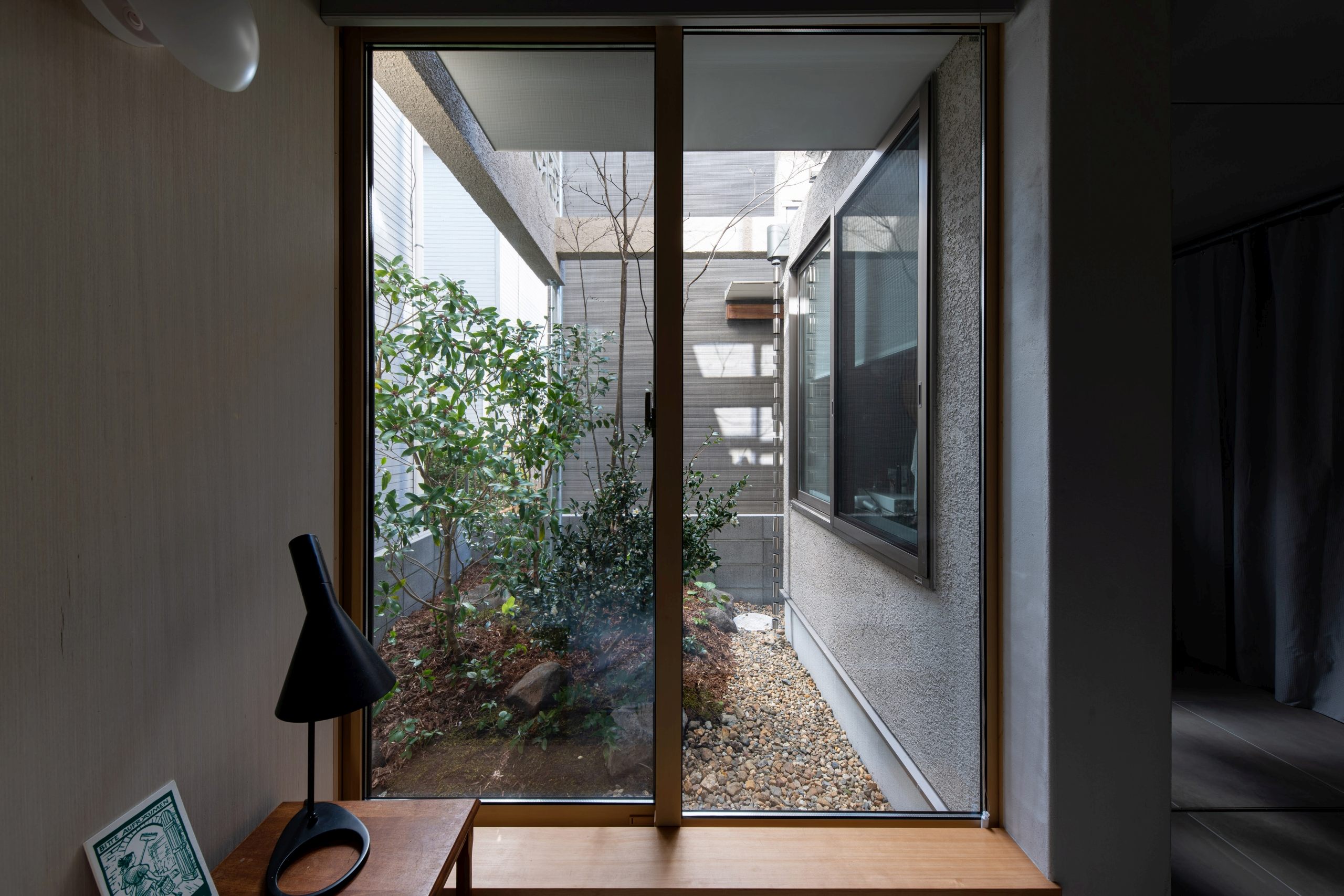At the moment, there are only two doors that serve as partitions, so people can feel each other’s presence even when they are far away from each other.It is also important to have a view of the greens from every corner of the house. In addition to the plants on the site, we created openings so that the neighboring plants can be enjoyed as borrowed scenery..