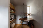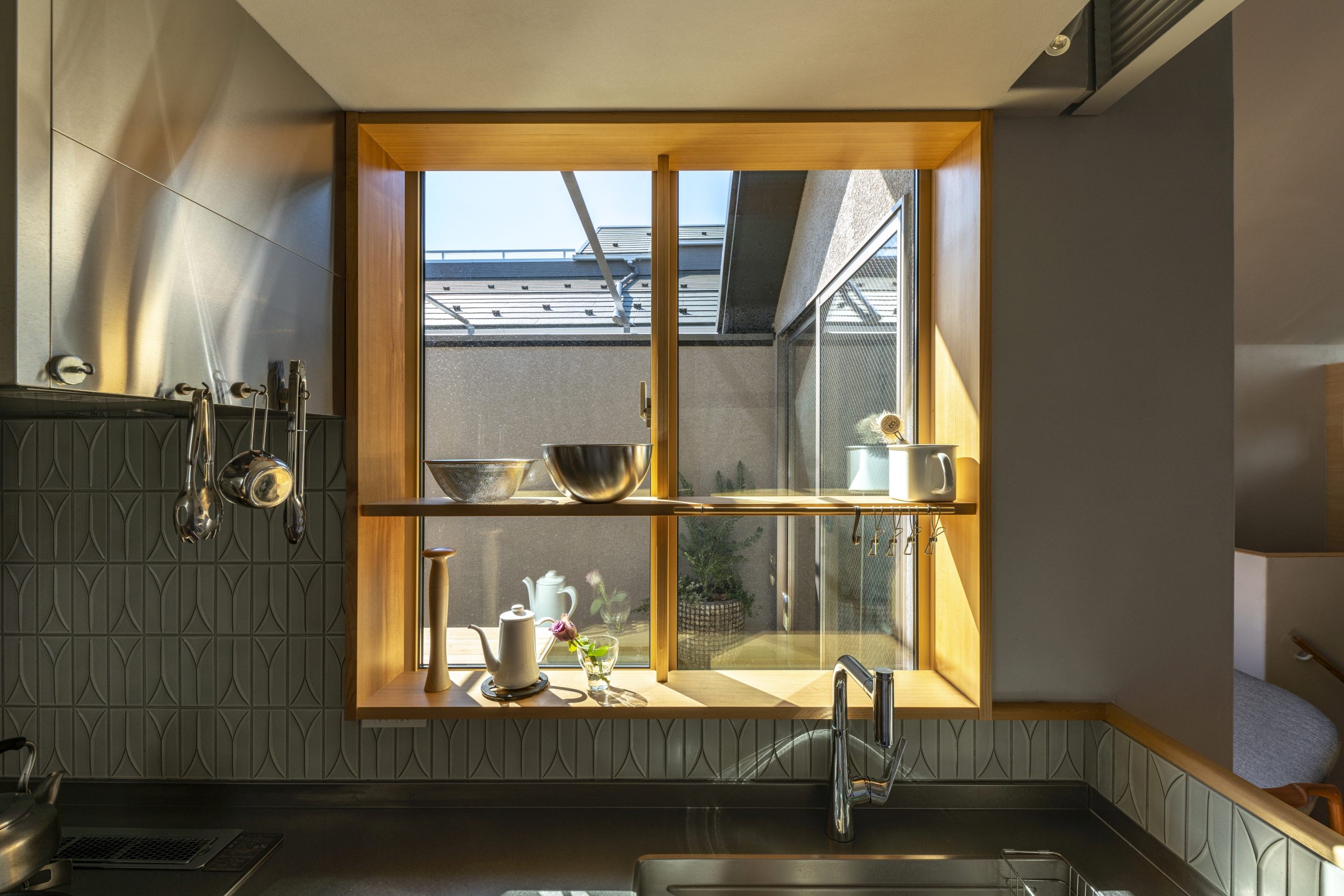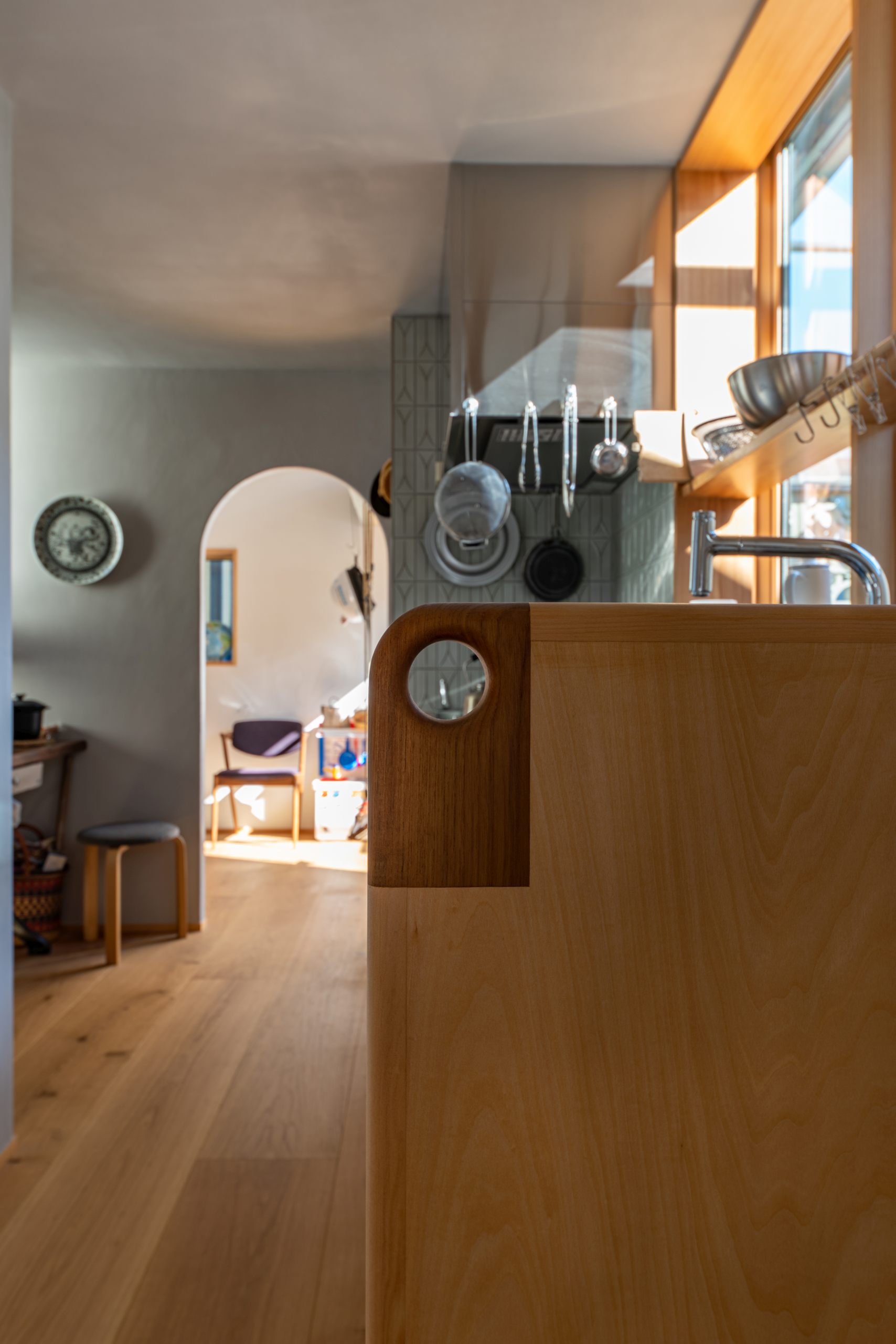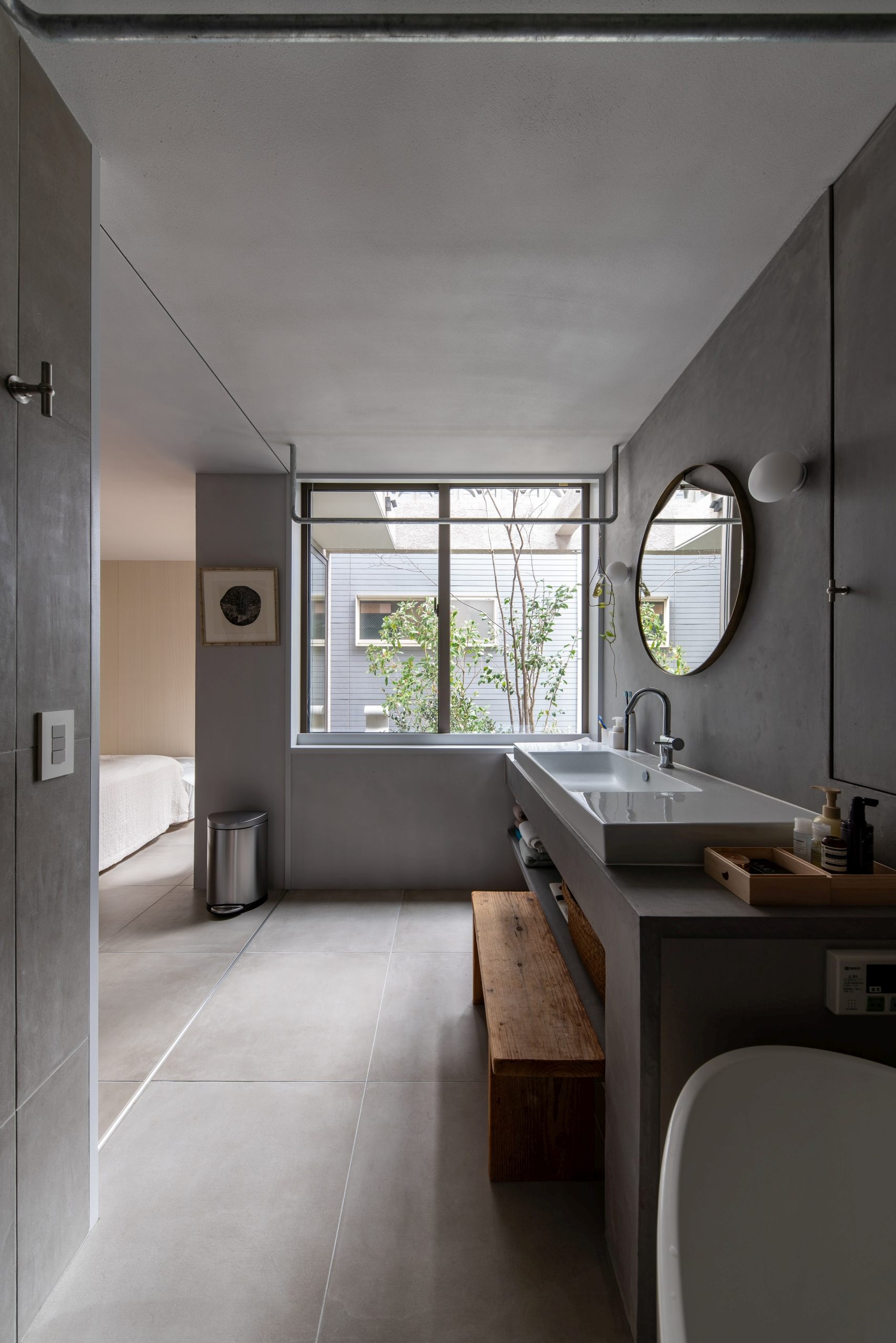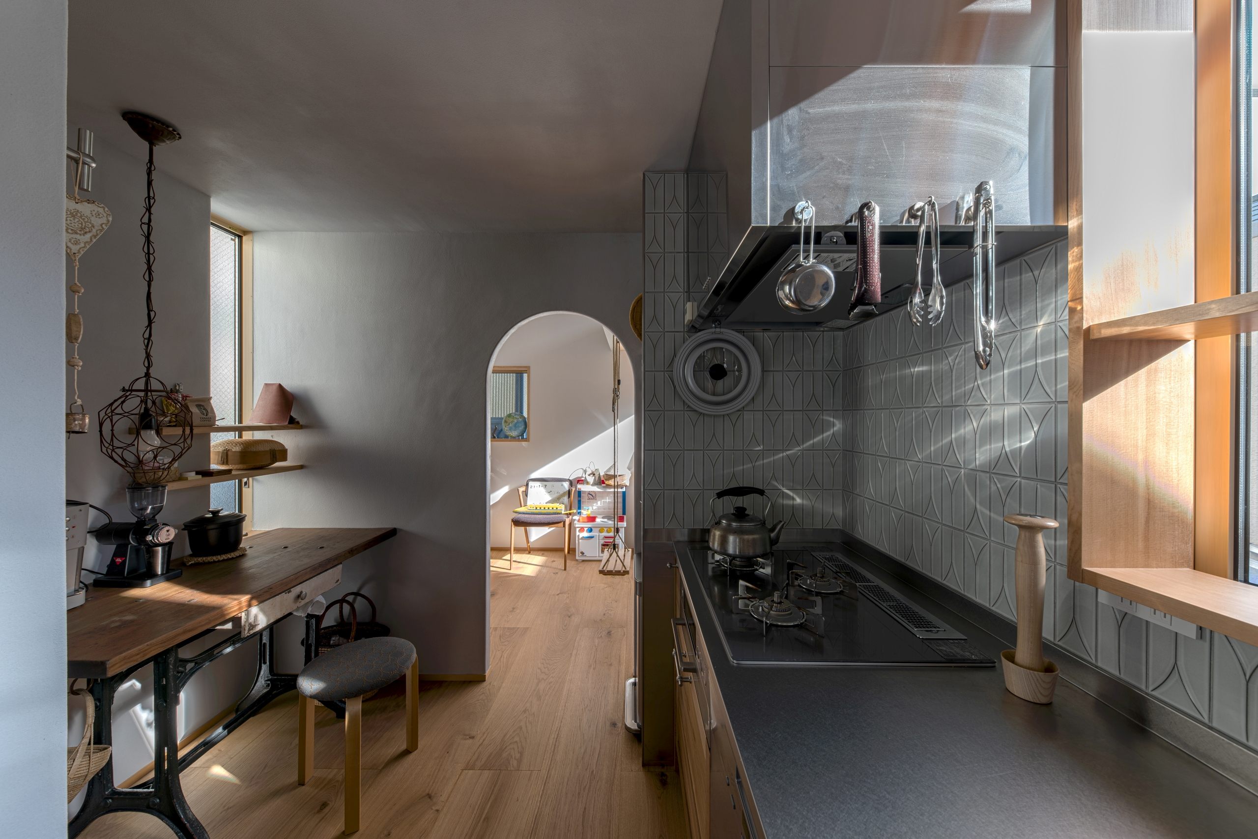 At the moment, there are only two doors that serve as partitions, so people can feel each other’s presence even when they are far away from each other.It is also important to have a view of the greens from every corner of the house. In addition to the plants on the site, we created openings so that the neighboring plants can be enjoyed as borrowed scenery..
