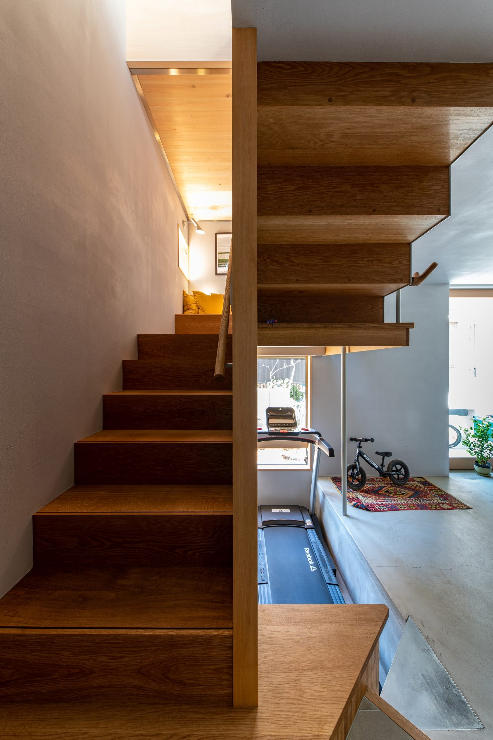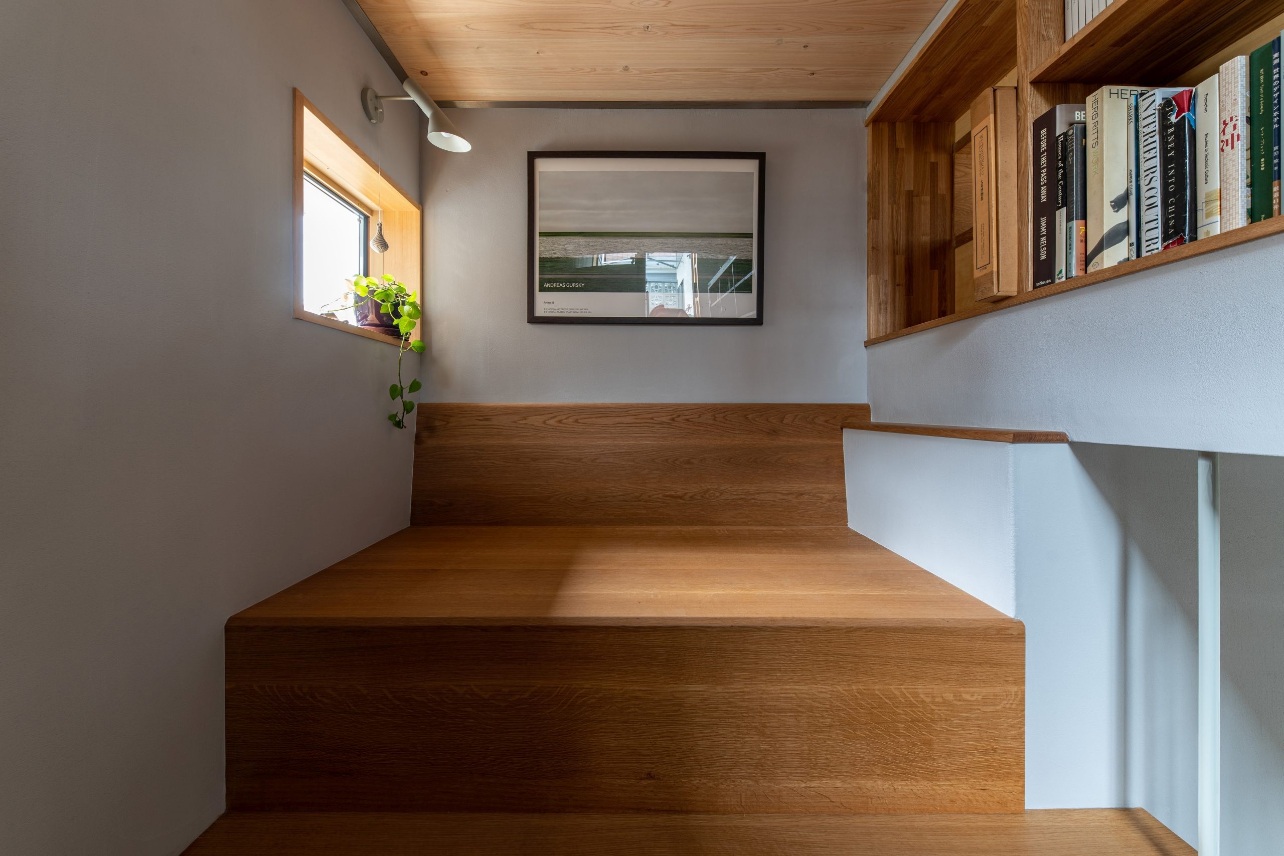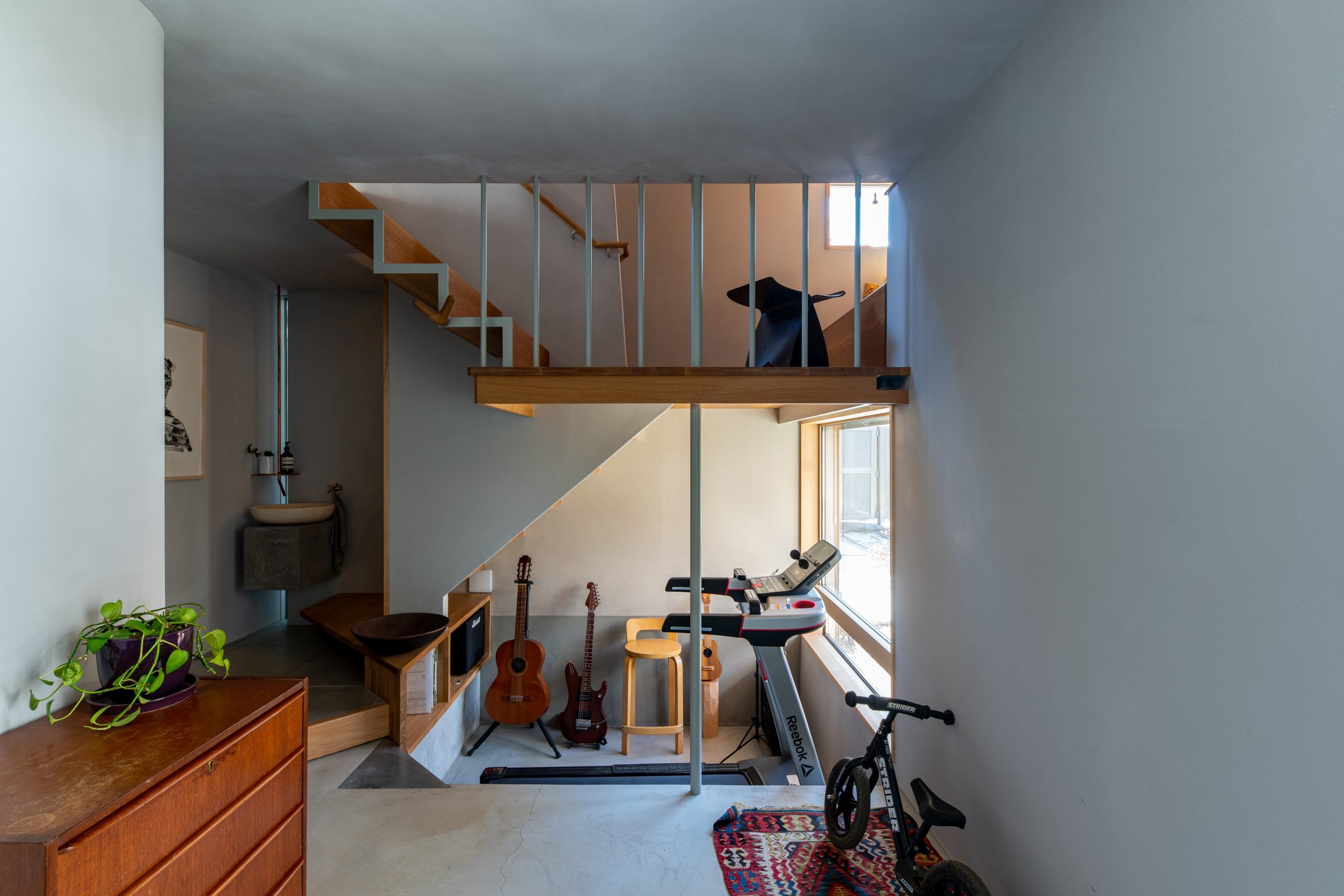 Instead of making the area bigger, all indoor spaces could be used on a regular basis, and designed all the rooms, including the entrance and toilet, to be used as place to stay. There is a living room and a small Japanese room where the family can gather, and when they want to get some distance from each other, they can spend their time reading, looking at plants, or playing musical instruments in the landing, the entrance, and other places.